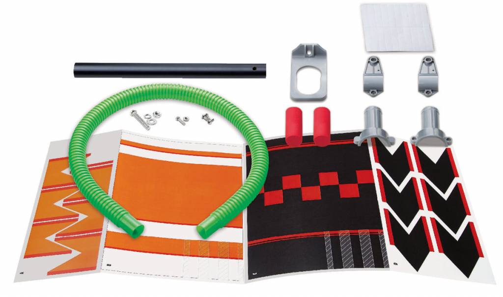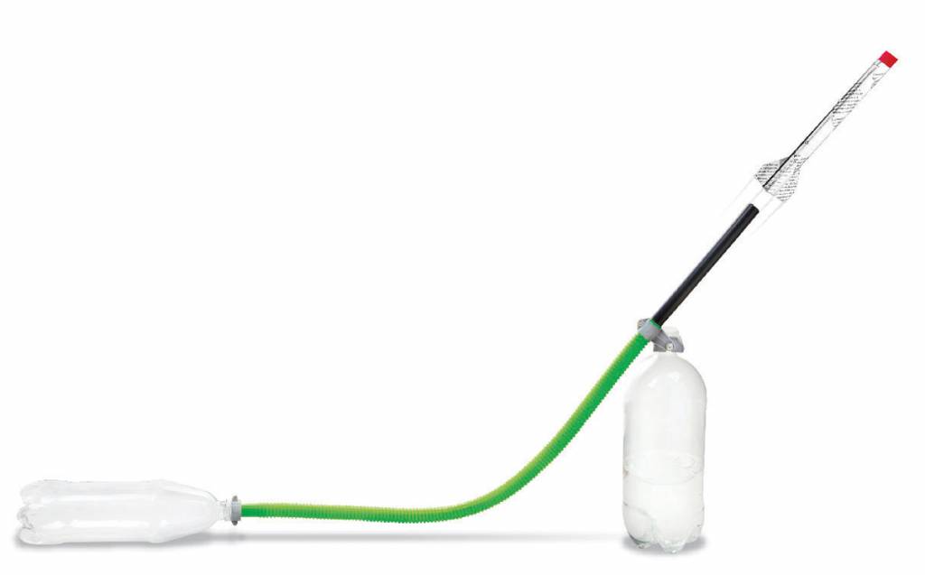 Inhoud: 1 set kleine bout en moer, 1 set grote bout en moer, sluitring en splitring, schroeven, 1 set dubbelzijdig plakband, 2 x flesverbindingshelften, 1x standarm, 1x lanceerbuis, 2x pijpklemhelften, 1x flexibele buis, 2x piepschuim raketkoppen, 12 x vinsjablonen, 2 x raketpompplaten, gedetaileerde instructies. Benodigd, maar niet inclusief in de set: kleine kruiskopschroevendraaier, plakband, schaar, 2 lege plastic flessen (1,25 liter of meer), oud papier.